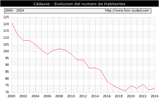 el numero de habitantes en Cádavos era de 73, 1 habitantes mas que el en el año 2023. En el grafico siguiente se puede ver cuantos habitantes tiene Cádavos a lo largo de los años.