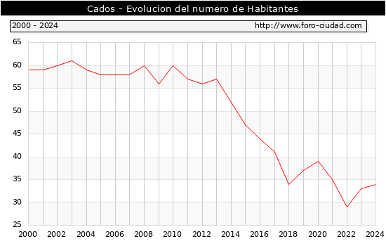 el numero de habitantes en Cados era de 34, 1 habitantes mas que el en el año 2023. En el grafico siguiente se puede ver cuantos habitantes tiene Cados a lo largo de los años.