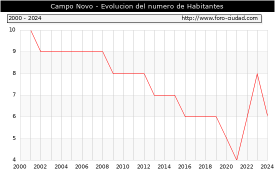 el numero de habitantes en Campo Novo era de 6, 2 habitantes menos que el en el año 2023. En el grafico siguiente se puede ver cuantos habitantes tiene Campo Novo a lo largo de los años.