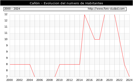 el numero de habitantes en Cañón era de 7, 1 habitantes menos que el en el año 2023. En el grafico siguiente se puede ver cuantos habitantes tiene Cañón a lo largo de los años.