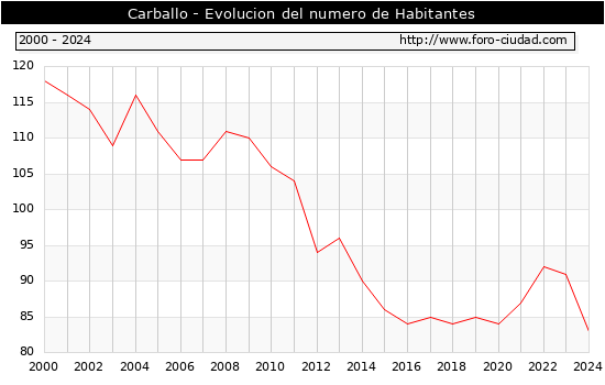 el numero de habitantes en Carballo era de 83, 8 habitantes menos que el en el año 2023. En el grafico siguiente se puede ver cuantos habitantes tiene Carballo a lo largo de los años.