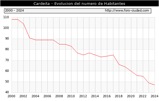 el numero de habitantes en Cardeita era de 47, 2 habitantes menos que el en el año 2023. En el grafico siguiente se puede ver cuantos habitantes tiene Cardeita a lo largo de los años.