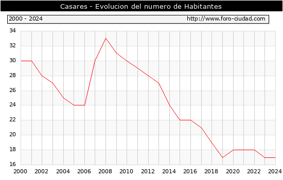 el numero de habitantes en Casares era de 17, igual numero de habitantes que el en el año 2023. En el grafico siguiente se puede ver cuantos habitantes tiene Casares a lo largo de los años.