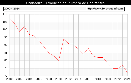 el numero de habitantes en Chandoiro era de 72, 5 habitantes menos que el en el año 2023. En el grafico siguiente se puede ver cuantos habitantes tiene Chandoiro a lo largo de los años.