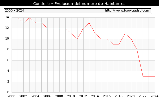 el numero de habitantes en Condelle era de 3, igual numero de habitantes que el en el año 2023. En el grafico siguiente se puede ver cuantos habitantes tiene Condelle a lo largo de los años.
