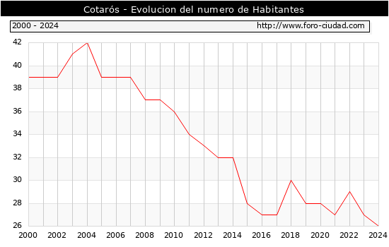 el numero de habitantes en Cotarós era de 26, 1 habitantes menos que el en el año 2023. En el grafico siguiente se puede ver cuantos habitantes tiene Cotarós a lo largo de los años.