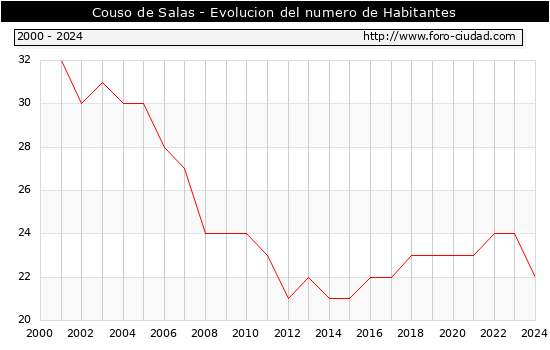 el numero de habitantes en Couso de Salas era de 22, 2 habitantes menos que el en el año 2023. En el grafico siguiente se puede ver cuantos habitantes tiene Couso de Salas a lo largo de los años.