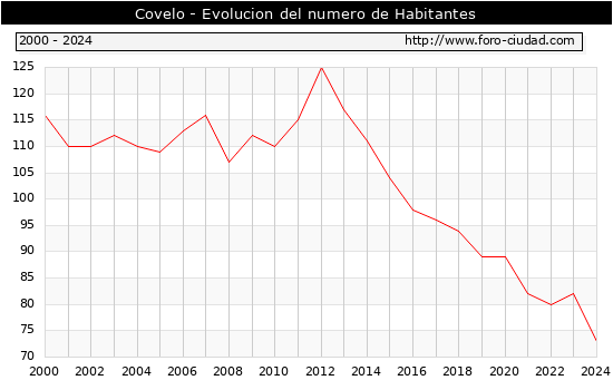 el numero de habitantes en Covelo era de 73, 9 habitantes menos que el en el año 2023. En el grafico siguiente se puede ver cuantos habitantes tiene Covelo a lo largo de los años.
