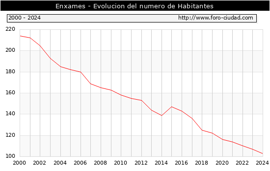 el numero de habitantes en Enxames era de 103, 4 habitantes menos que el en el año 2023. En el grafico siguiente se puede ver cuantos habitantes tiene Enxames a lo largo de los años.