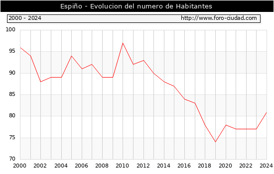 el numero de habitantes en Espiño era de 81, 4 habitantes mas que el en el año 2023. En el grafico siguiente se puede ver cuantos habitantes tiene Espiño a lo largo de los años.