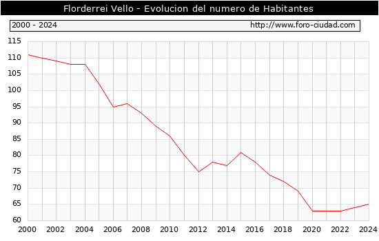 el numero de habitantes en Florderrei Vello era de 65, 1 habitantes mas que el en el año 2023. En el grafico siguiente se puede ver cuantos habitantes tiene Florderrei Vello a lo largo de los años.
