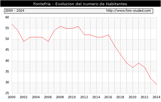 el numero de habitantes en Fontefría era de 29, 3 habitantes menos que el en el año 2023. En el grafico siguiente se puede ver cuantos habitantes tiene Fontefría a lo largo de los años.
