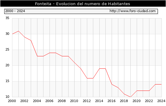 el numero de habitantes en Fonteita era de 14, igual numero de habitantes que el en el año 2023. En el grafico siguiente se puede ver cuantos habitantes tiene Fonteita a lo largo de los años.