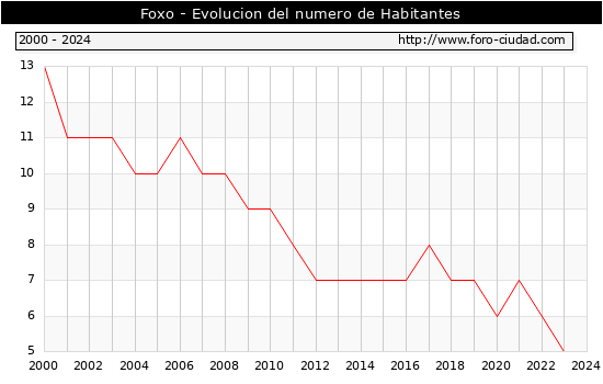 el numero de habitantes en Foxo era de 5, igual numero de habitantes que el en el año 2023. En el grafico siguiente se puede ver cuantos habitantes tiene Foxo a lo largo de los años.
