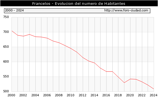 el numero de habitantes en Francelos era de 509, 13 habitantes menos que el en el año 2023. En el grafico siguiente se puede ver cuantos habitantes tiene Francelos a lo largo de los años.
