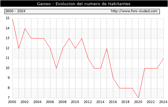 Segun los datos publicados por el INE a 1 de Enero de 2024 el numero de habitantes en Gaioso era de 11, 1 habitantes mas que el en el año 2023. En el grafico siguiente se puede ver cuantos habitantes tiene Gaioso a lo largo de los años.