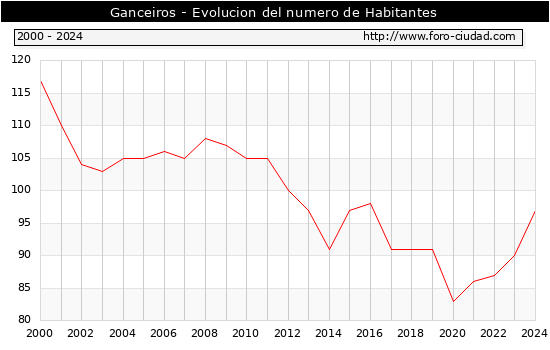 el numero de habitantes en Ganceiros era de 97, 7 habitantes mas que el en el año 2023. En el grafico siguiente se puede ver cuantos habitantes tiene Ganceiros a lo largo de los años.
