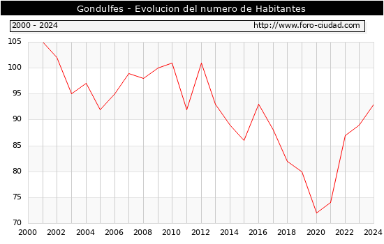 el numero de habitantes en Gondulfes era de 93, 4 habitantes mas que el en el año 2023. En el grafico siguiente se puede ver cuantos habitantes tiene Gondulfes a lo largo de los años.