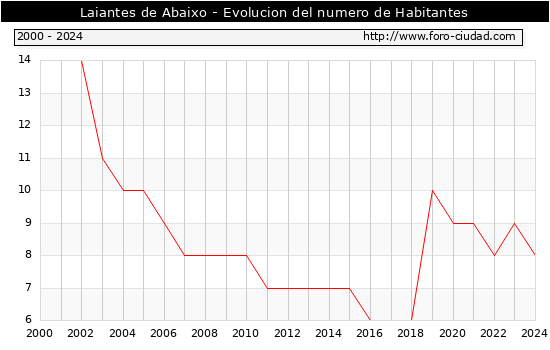 el numero de habitantes en Laiantes de Abaixo era de 8, 1 habitantes menos que el en el año 2023. En el grafico siguiente se puede ver cuantos habitantes tiene Laiantes de Abaixo a lo largo de los años.