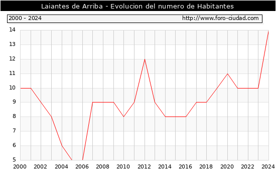 el numero de habitantes en Laiantes de Arriba era de 14, 4 habitantes mas que el en el año 2023. En el grafico siguiente se puede ver cuantos habitantes tiene Laiantes de Arriba a lo largo de los años.