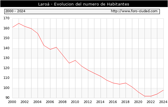el numero de habitantes en Laroá era de 98, 4 habitantes mas que el en el año 2023. En el grafico siguiente se puede ver cuantos habitantes tiene Laroá a lo largo de los años.