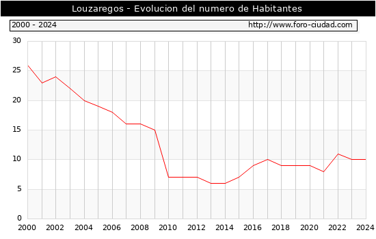 el numero de habitantes en Louzaregos era de 10, igual numero de habitantes que el en el año 2023. En el grafico siguiente se puede ver cuantos habitantes tiene Louzaregos a lo largo de los años.