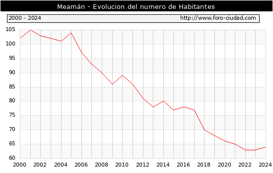 el numero de habitantes en Meamán era de 64, 1 habitantes mas que el en el año 2023. En el grafico siguiente se puede ver cuantos habitantes tiene Meamán a lo largo de los años.