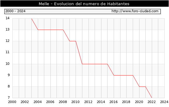 el numero de habitantes en Melle era de 7, igual numero de habitantes que el en el año 2023. En el grafico siguiente se puede ver cuantos habitantes tiene Melle a lo largo de los años.