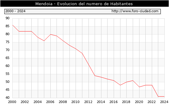 el numero de habitantes en Mendoia era de 41, igual numero de habitantes que el en el año 2023. En el grafico siguiente se puede ver cuantos habitantes tiene Mendoia a lo largo de los años.