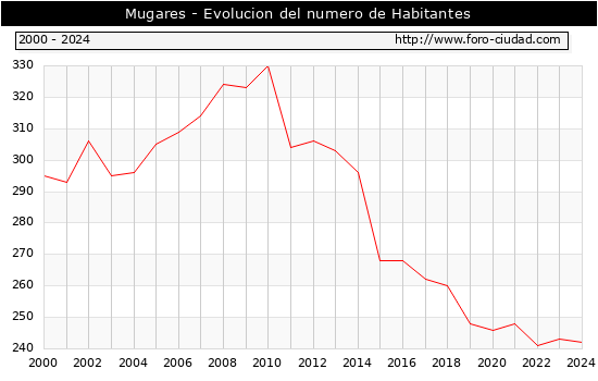 el numero de habitantes en Mugares era de 242, 1 habitantes menos que el en el año 2023. En el grafico siguiente se puede ver cuantos habitantes tiene Mugares a lo largo de los años.