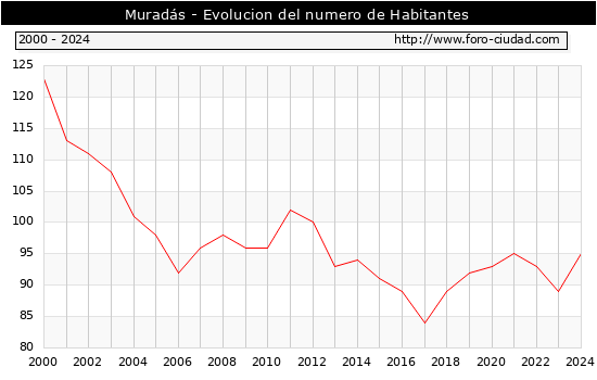 el numero de habitantes en Muradás era de 95, 6 habitantes mas que el en el año 2023. En el grafico siguiente se puede ver cuantos habitantes tiene Muradás a lo largo de los años.