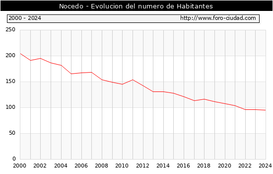 el numero de habitantes en Nocedo era de 95, 1 habitantes menos que el en el año 2023. En el grafico siguiente se puede ver cuantos habitantes tiene Nocedo a lo largo de los años.
