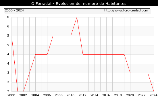 el numero de habitantes en O Ferradal era de 2, 1 habitantes menos que el en el año 2023. En el grafico siguiente se puede ver cuantos habitantes tiene O Ferradal a lo largo de los años.