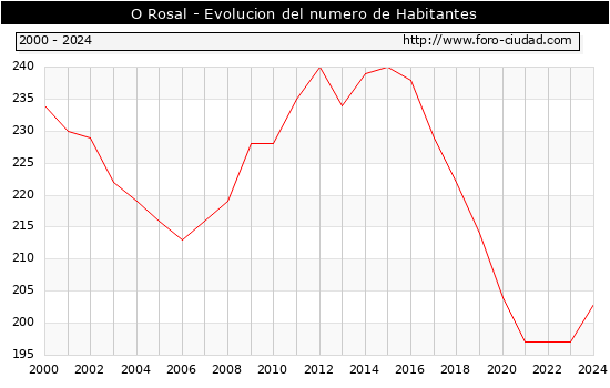 el numero de habitantes en O Rosal era de 203, 6 habitantes mas que el en el año 2023. En el grafico siguiente se puede ver cuantos habitantes tiene O Rosal a lo largo de los años.