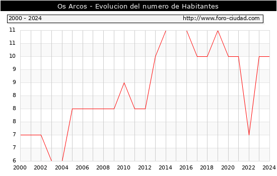el numero de habitantes en Os Arcos era de 10, igual numero de habitantes que el en el año 2023. En el grafico siguiente se puede ver cuantos habitantes tiene Os Arcos a lo largo de los años.