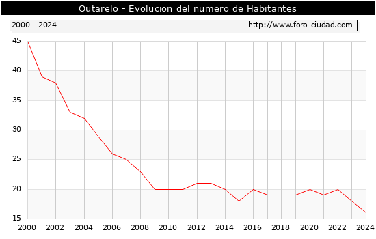 el numero de habitantes en Outarelo era de 16, 2 habitantes menos que el en el año 2023. En el grafico siguiente se puede ver cuantos habitantes tiene Outarelo a lo largo de los años.
