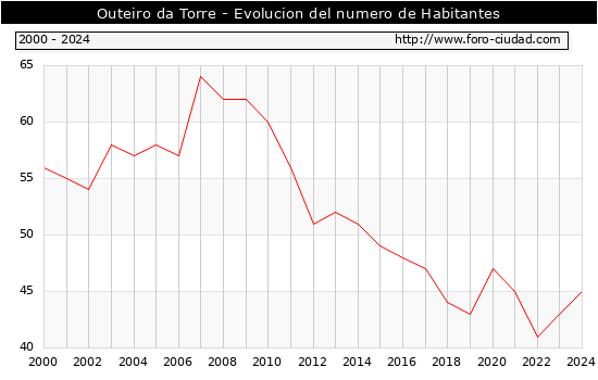 el numero de habitantes en Outeiro da Torre era de 45, 2 habitantes mas que el en el año 2023. En el grafico siguiente se puede ver cuantos habitantes tiene Outeiro da Torre a lo largo de los años.