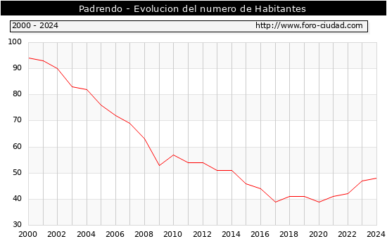 el numero de habitantes en Padrendo era de 48, 1 habitantes mas que el en el año 2023. En el grafico siguiente se puede ver cuantos habitantes tiene Padrendo a lo largo de los años.