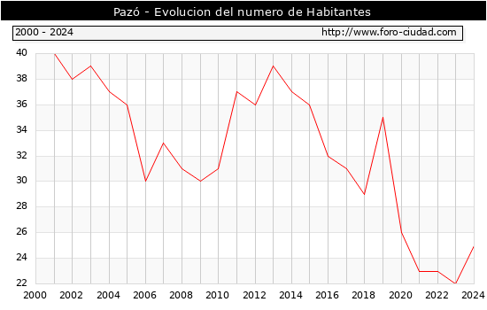 el numero de habitantes en Pazó era de 25, 3 habitantes mas que el en el año 2023. En el grafico siguiente se puede ver cuantos habitantes tiene Pazó a lo largo de los años.