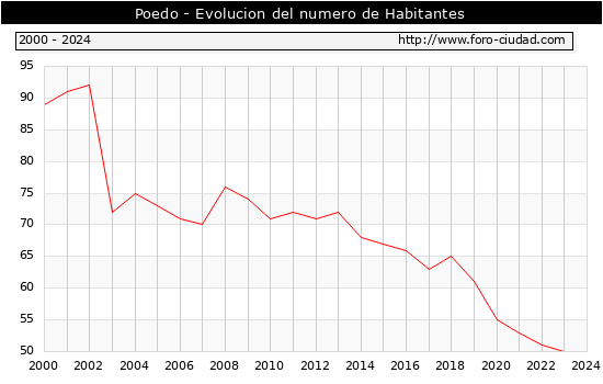 el numero de habitantes en Poedo era de 50, igual numero de habitantes que el en el año 2023. En el grafico siguiente se puede ver cuantos habitantes tiene Poedo a lo largo de los años.