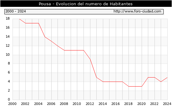 el numero de habitantes en Pousa era de 5, 1 habitantes mas que el en el año 2023. En el grafico siguiente se puede ver cuantos habitantes tiene Pousa a lo largo de los años.