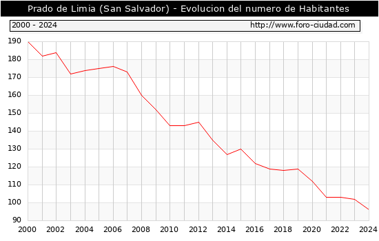 el numero de habitantes en Prado de Limia (San Salvador) era de 96, 6 habitantes menos que el en el año 2023. En el grafico siguiente se puede ver cuantos habitantes tiene Prado de Limia (San Salvador) a lo largo de los años.
