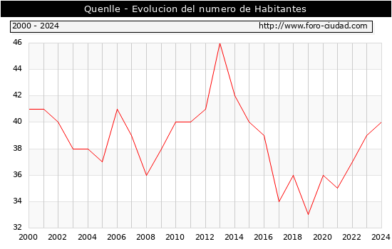 el numero de habitantes en Quenlle era de 40, 1 habitantes mas que el en el año 2023. En el grafico siguiente se puede ver cuantos habitantes tiene Quenlle a lo largo de los años.