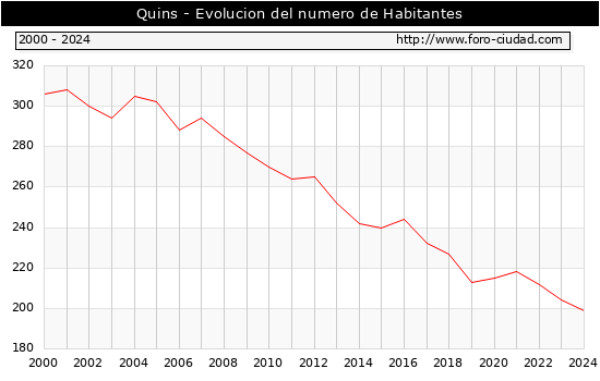 el numero de habitantes en Quins era de 199, 5 habitantes menos que el en el año 2023. En el grafico siguiente se puede ver cuantos habitantes tiene Quins a lo largo de los años.