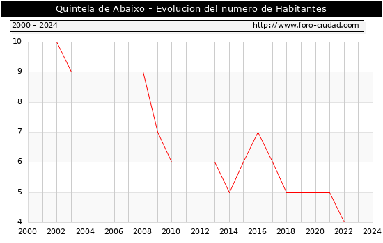 el numero de habitantes en Quintela de Abaixo era de 4, igual numero de habitantes que el en el año 2023. En el grafico siguiente se puede ver cuantos habitantes tiene Quintela de Abaixo a lo largo de los años.