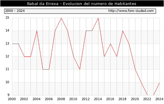 el numero de habitantes en Rabal da Eirexa era de 10, 1 habitantes mas que el en el año 2023. En el grafico siguiente se puede ver cuantos habitantes tiene Rabal da Eirexa a lo largo de los años.