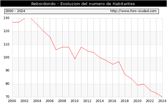 el numero de habitantes en Rebordondo era de 70, 3 habitantes menos que el en el año 2023. En el grafico siguiente se puede ver cuantos habitantes tiene Rebordondo a lo largo de los años.