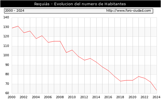 el numero de habitantes en Requiás era de 63, 9 habitantes menos que el en el año 2023. En el grafico siguiente se puede ver cuantos habitantes tiene Requiás a lo largo de los años.