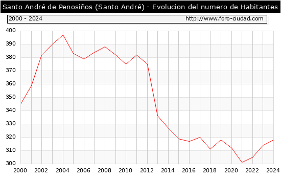 el numero de habitantes en Santo André de Penosiños (Santo André) era de 318, 4 habitantes mas que el en el año 2023. En el grafico siguiente se puede ver cuantos habitantes tiene Santo André de Penosiños (Santo André) a lo largo de los años.