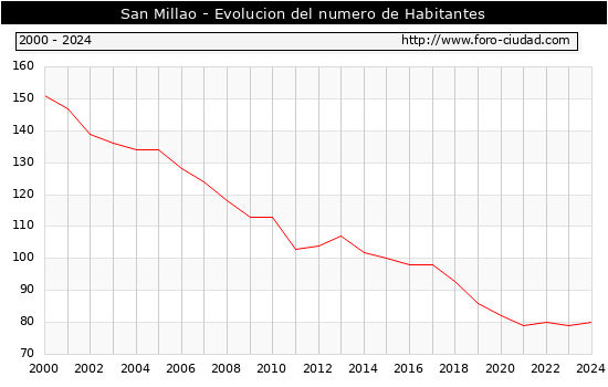 el numero de habitantes en San Millao era de 80, 1 habitantes mas que el en el año 2023. En el grafico siguiente se puede ver cuantos habitantes tiene San Millao a lo largo de los años.